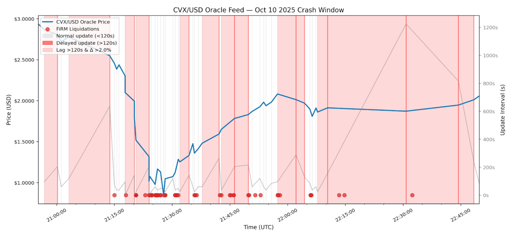 The most critical period occurred during the crash epicenter between 21:17-21:25 UTC (8 minutes), when CVX/USD fell from approximately $2.30 to $0.98—a 58% decline compressed into five consecutive oracle rounds. Each of these updates exceeded 5-25% deviation, with the largest single-round move at -25.1%. Update intervals during this window were irregular (36-204 seconds), with three lagged updates exceeding 2 minutes.